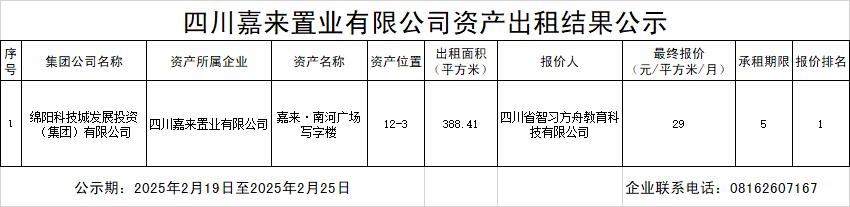 四川嘉來(lái)置業(yè)有限公司資產(chǎn)出租結(jié)果公示