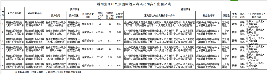 綿陽富樂山九洲國際酒店有限公司資產(chǎn)出租公告