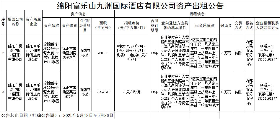 綿陽(yáng)富樂(lè)山九洲國(guó)際酒店有限公司資產(chǎn)出租公告