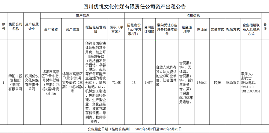 四川優(yōu)悅文化傳媒有限責(zé)任公司資產(chǎn)出租公告