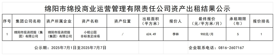 綿陽(yáng)市綿投商業(yè)運(yùn)營(yíng)管理有限責(zé)任公司資產(chǎn)出租結(jié)果公示