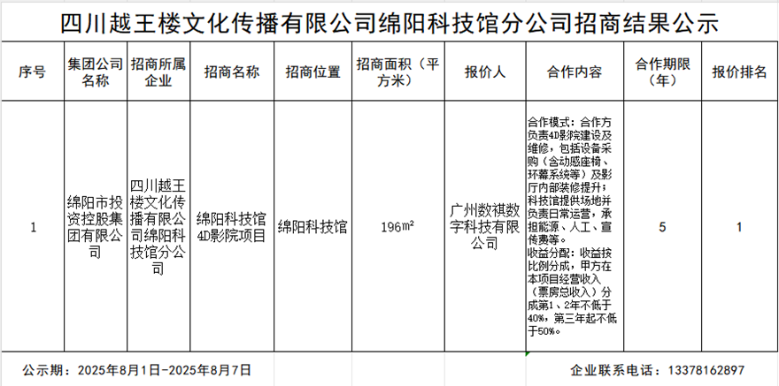 四川越王樓文化傳播有限公司綿陽(yáng)科技城分公司招商結(jié)果公示