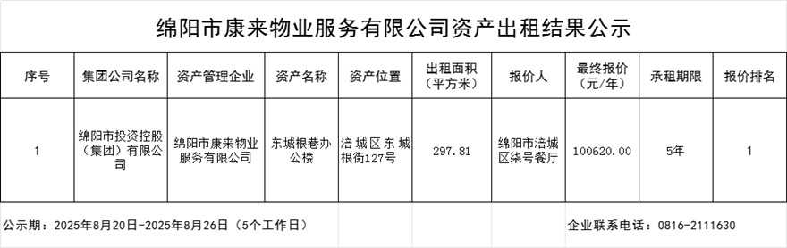 綿陽市康來物業(yè)服務有限公司資產(chǎn)出租結(jié)果公示