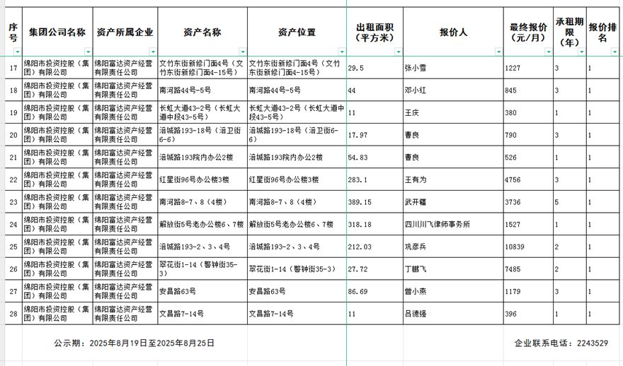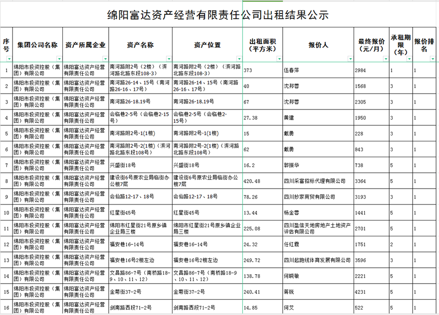 綿陽(yáng)富達(dá)資產(chǎn)經(jīng)營(yíng)有限責(zé)任公司出租結(jié)果公示