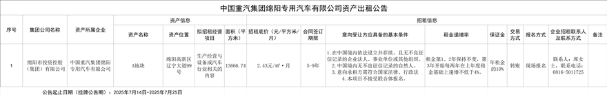 中國(guó)重汽集團(tuán)綿陽專用汽車有限公司資產(chǎn)出租公告