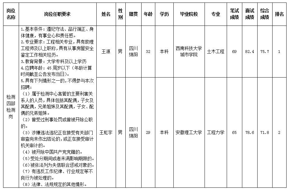 根據(jù)綿陽(yáng)市建設(shè)工程質(zhì)量檢測(cè)中心有限責(zé)任公司發(fā)布的招聘公告及招聘相關(guān)規(guī)定,現(xiàn)將筆試、面試成績(jī)予以公示。