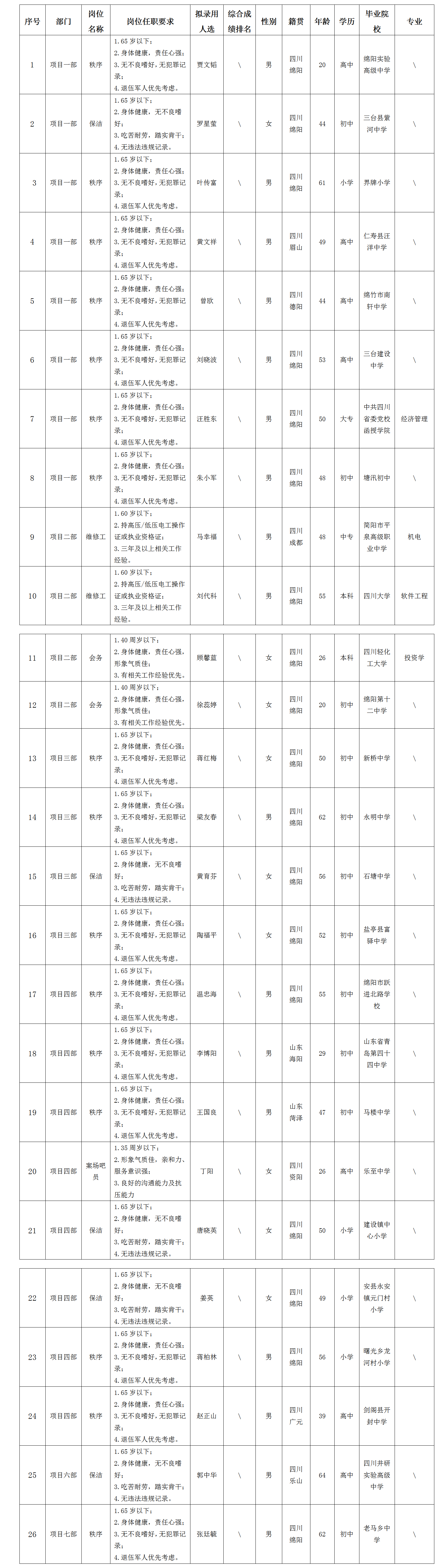 根據(jù)綿陽市康來物業(yè)服務(wù)有限公司發(fā)布的招聘公告及招聘相關(guān)規(guī)定,經(jīng)面試等程序,擬錄用賈文韜等同志到各項(xiàng)目部工作,現(xiàn)予以公示,具體情況如下: