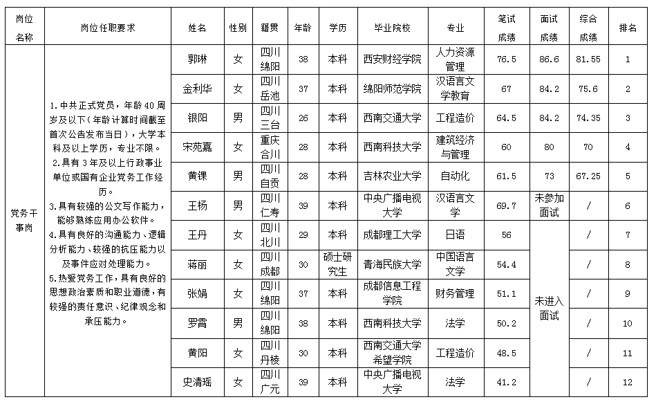 根據(jù)綿陽市投資控股(集團(tuán))有限公司發(fā)布的招聘公告及招聘相關(guān)規(guī)定,經(jīng)筆試、面試等程序,現(xiàn)將筆試(面試)成績(jī)予以公示。