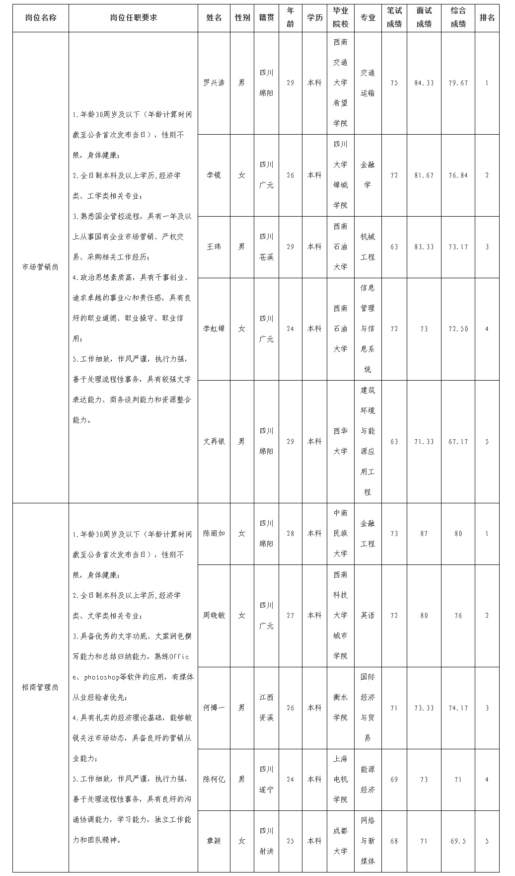 根據(jù)綿陽市綿投商業(yè)運(yùn)營管理有限責(zé)任公司發(fā)布的招聘公告及招聘相關(guān)規(guī)定,經(jīng)筆試、面試等程序,現(xiàn)將筆試、面試成績予以公示。