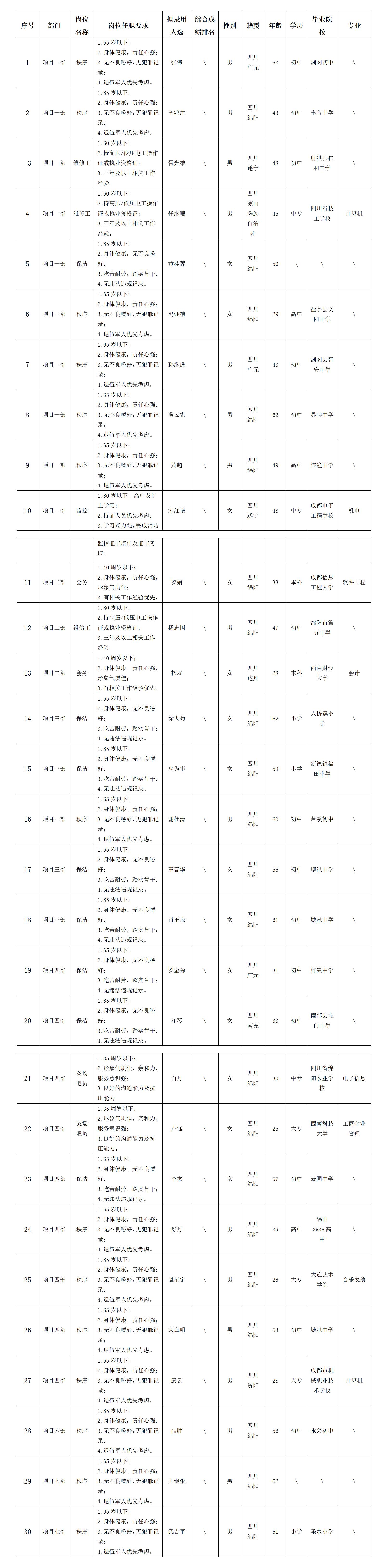 根據(jù)綿陽市康來物業(yè)服務有限公司發(fā)布的招聘公告及招聘相關規(guī)定,經(jīng)面試等程序,擬錄用張偉等同志到各項目部工作,現(xiàn)予以公示,具體情況如下: