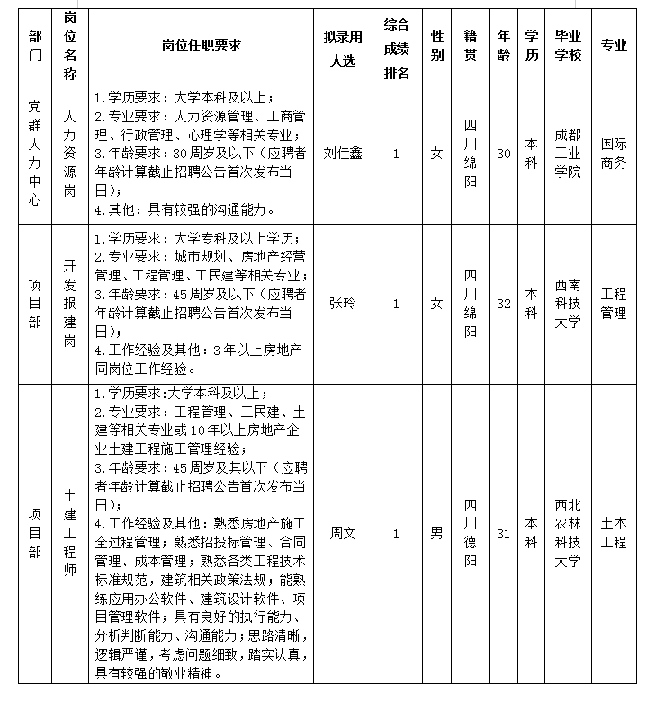 根據(jù)綿陽(yáng)市綿投置地有限公司發(fā)布的招聘公告及招聘相關(guān)規(guī)定,經(jīng)筆試、面試、考察、體檢等程序,擬錄用劉佳鑫等3名同志到綿陽(yáng)市綿投置地有限公司工作,現(xiàn)予以公示,具體情況如下: