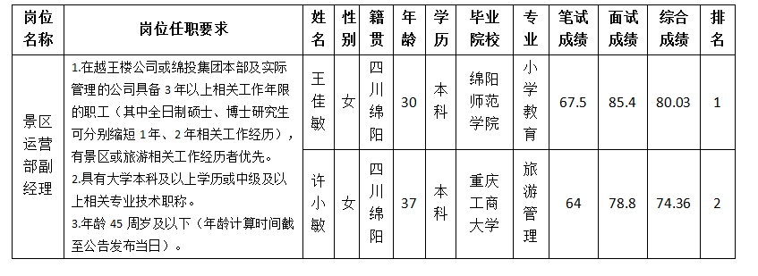 根據(jù)四川越王樓文化傳播有限公司發(fā)布的招聘公告及招聘相關(guān)規(guī)定,經(jīng)筆試、面試等程序,現(xiàn)將筆試(面試)成績(jī)予以公示。