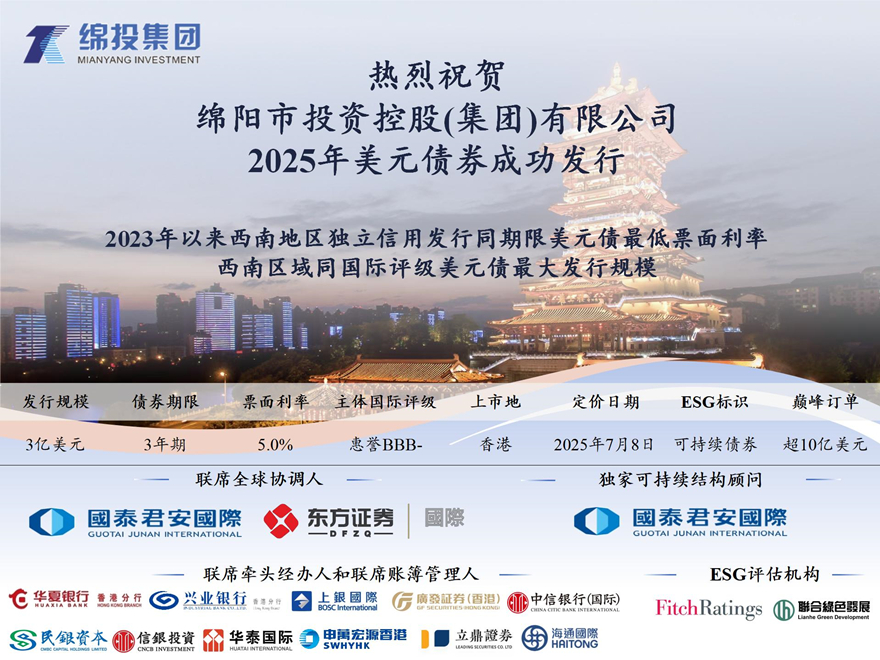 7月8日,綿投集團(tuán)成功定價(jià)發(fā)行3億美元、3年期可持續(xù)美元債券,認(rèn)購倍數(shù)3.43倍(峰值訂單超10億美元),最終票面利率強(qiáng)勢(shì)鎖定5.00%,較初始價(jià)格指引大幅收窄70個(gè)基點(diǎn),創(chuàng)2023年以來西南地區(qū)獨(dú)立信用發(fā)行同期限境外美元債最低票面利率、西南區(qū)域同國(guó)際評(píng)級(jí)美元債最大發(fā)行規(guī)模,以及創(chuàng)2025年以來中資投資級(jí)地方國(guó)企美元債最大收窄幅度。