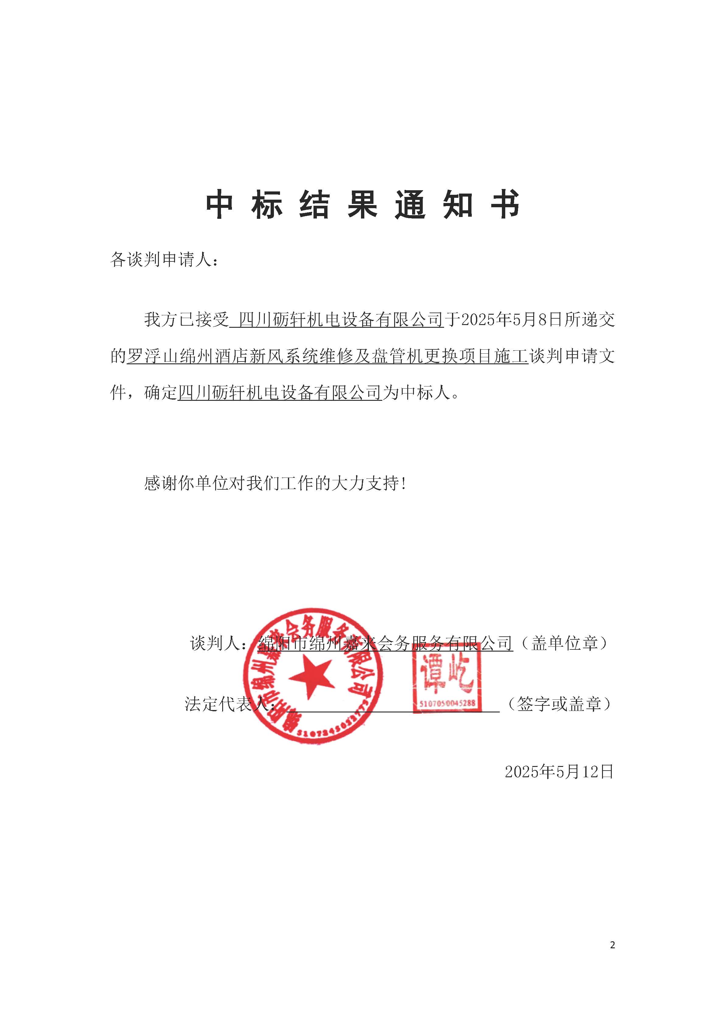 羅浮山綿州酒店新風(fēng)系統(tǒng)維修及盤管機更換項目施工中標(biāo)結(jié)果通知