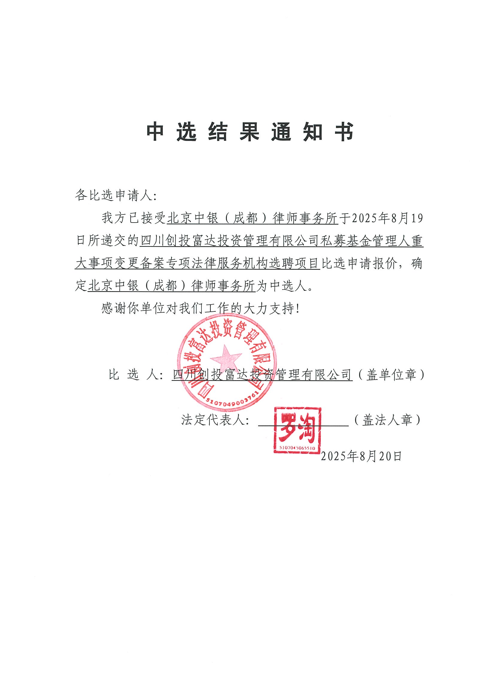創(chuàng)投富達(dá)私募基金管理人重大事項變更備案專項法律服務(wù)機構(gòu)選聘中選結(jié)果通知
